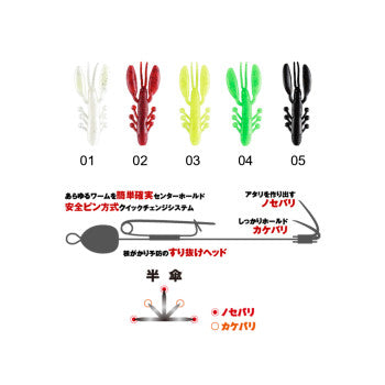 La versione da 110 millimetri è abbinata a un gambero siliconico da 3", che può essere sostituito con un classico pezzo di stoffa bianca o con un'esca naturale come sarda, calamaro o gambero. Sono disponibili varie colorazioni.